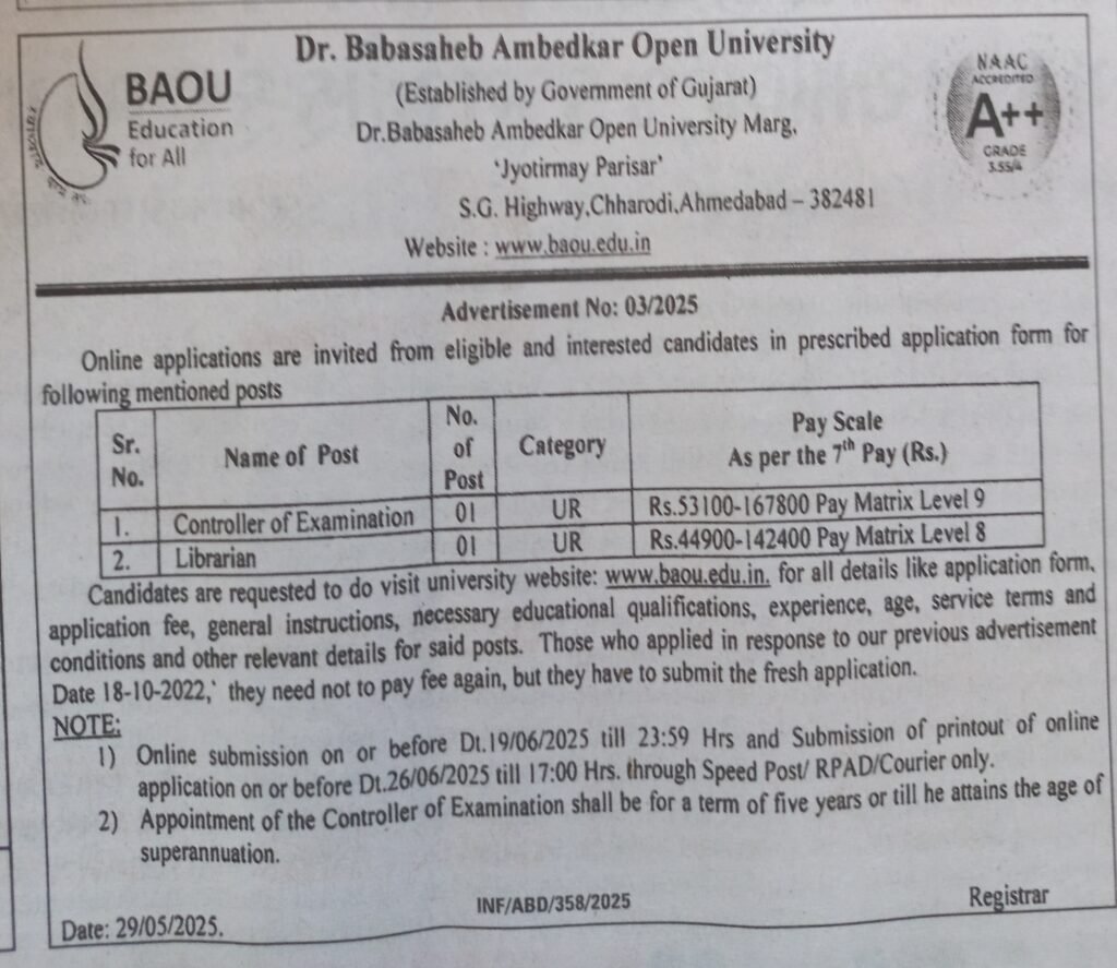 BAOU Recruitment 2025 : Dr. Babasaheb Ambedkar Open University (BAOU), established by the Government of Gujarat and accredited with NAAC A++ grade, has released Advertisement No. 03/2025 inviting online applications for the recruitment of eligible candidates to the following prestigious positions: