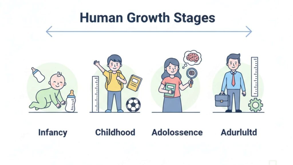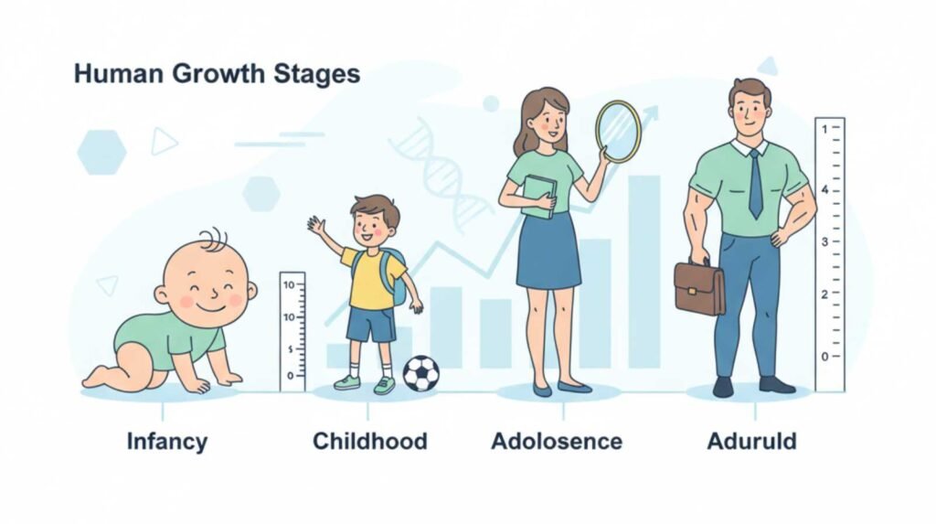 - વૃદ્ધિની પ્રક્રિયા ગર્ભાધાનથી શરૂ થાય છે પરંતુ તે આજીવન ચાલતી નથી; તે અમુક ઉંમરે (લગભગ 18-19 વર્ષે) અટકી જાય છે.